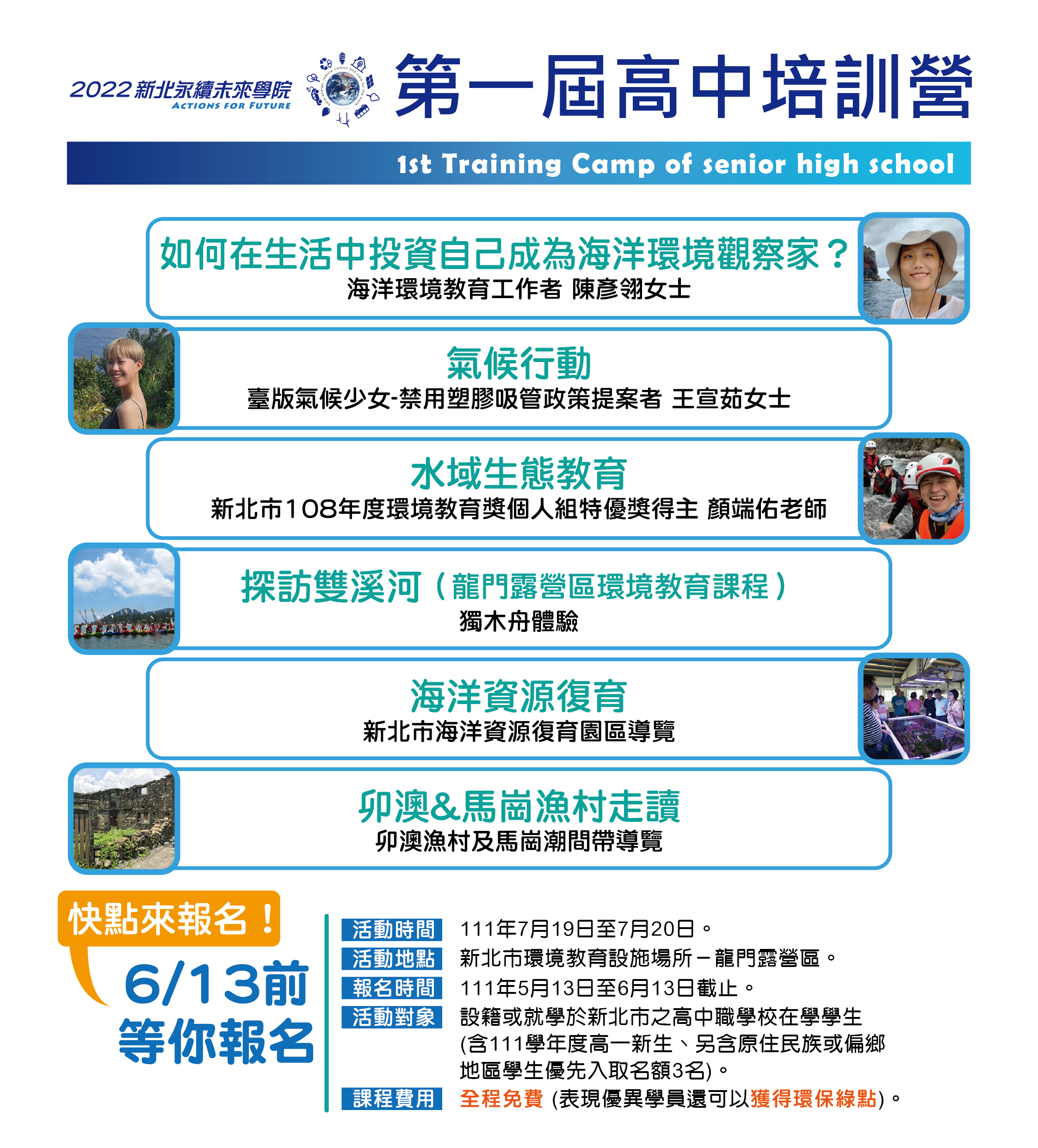 2022新北永續未來學院 第一屆高中培訓營,目標培養學員對環境正面的價值觀和態度,增進保護及管理環境所需要的技能。快加入我們一同回應和解決環境問題,成為新北環保青!