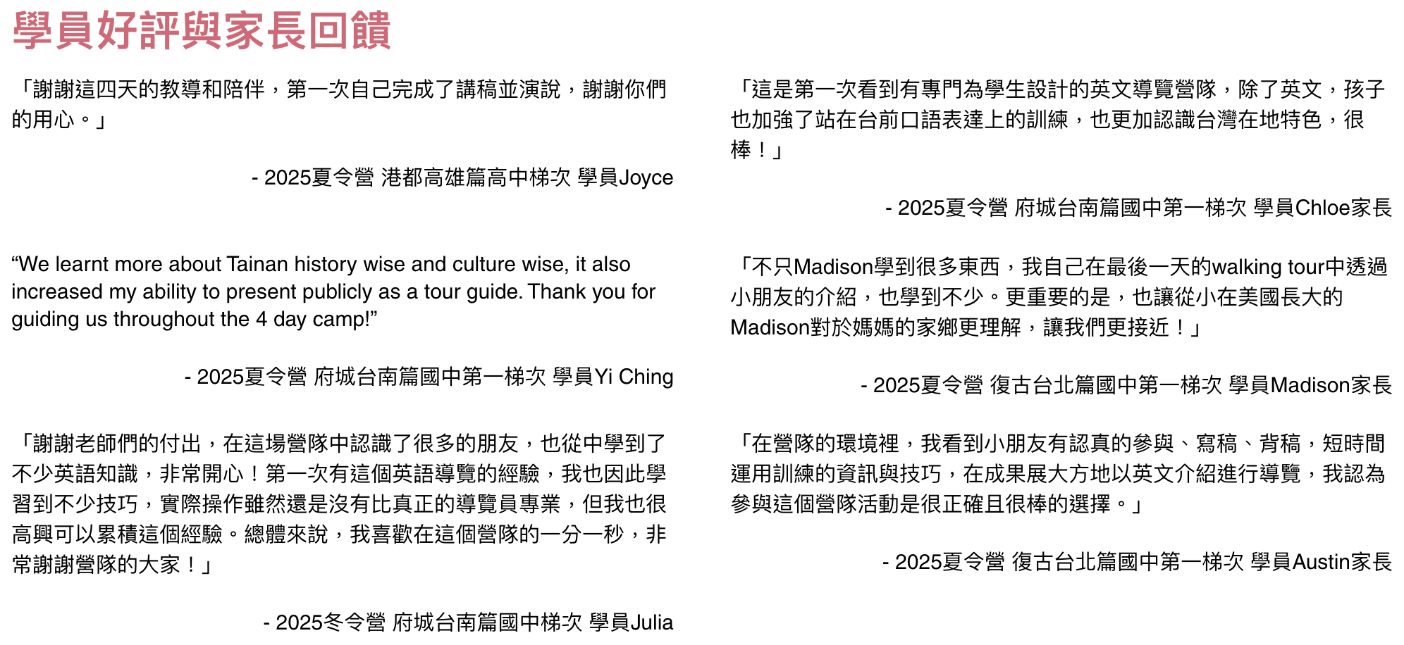 營期中更有生動有趣的導覽技巧訓練及在地特色發掘等課程,讓孩子從各種角度培養專業英語導覽素養。最後,再以英語向家長詮釋這段家鄉的歷史,同時達到國民外交的目的,賦予台灣價值新的意義。