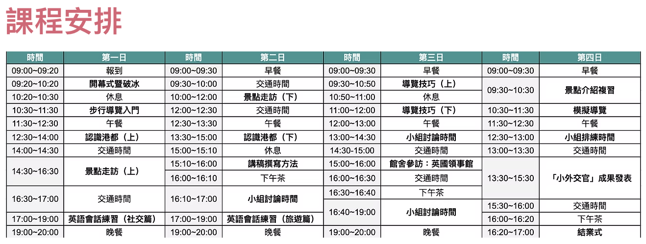 「青年外交官英語導覽營隊」涵蓋室內課程與室外活動,透過空間的轉換增加營隊的趣味性。全英文景點走訪,讓孩子走出教室,在名勝古蹟間用英語學習台灣的歷史和文化,跳脫學校語言教學框架,在生活中自然應用英文,讓寒、暑假期成為在校學習的延伸。