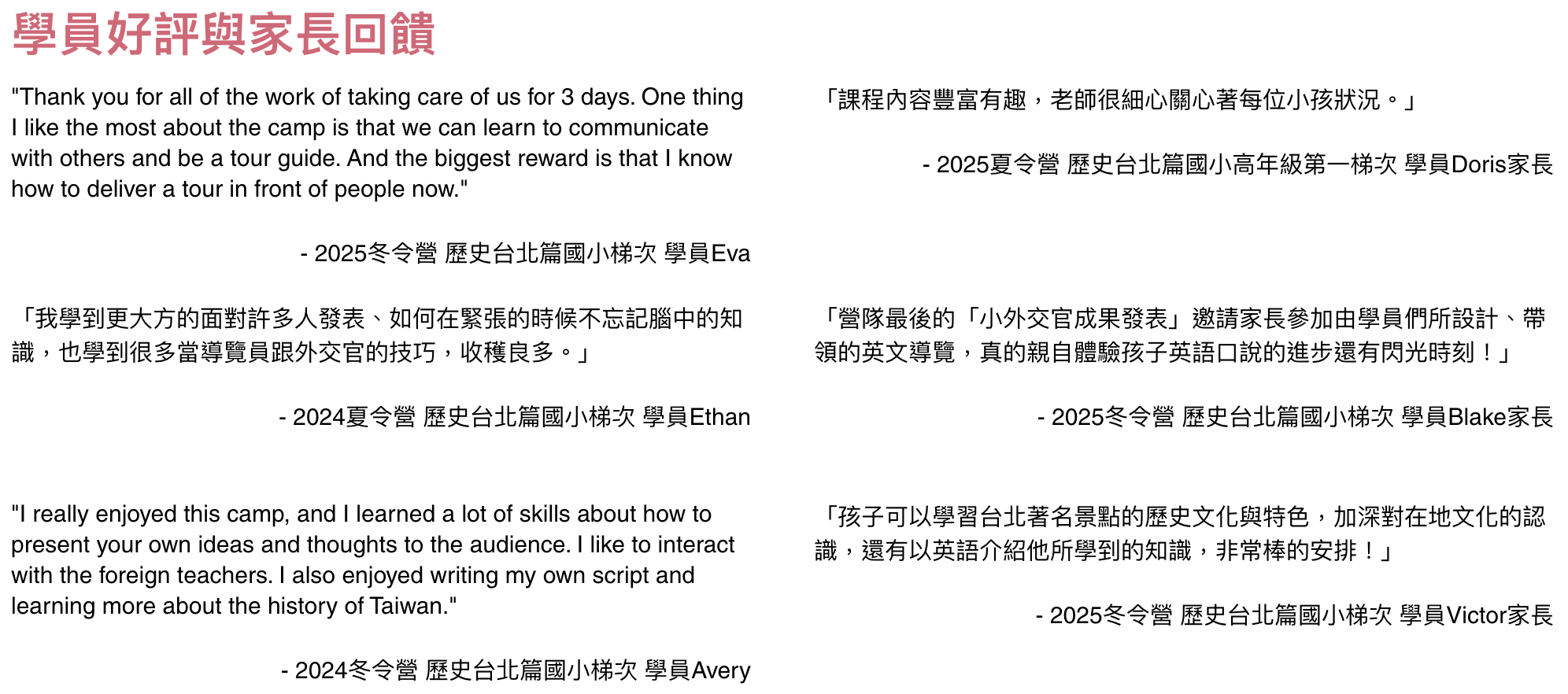 「連孩子自己也能感受到成長並享受其中的營隊」,營期間除了以全英文進行授課,更強調孩子的輸出,讓每位學員的英語口語表達都能夠深入人心。