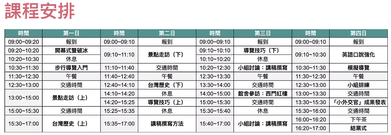 「青年外交官英語導覽營隊」涵蓋室內課程與室外活動,透過空間的轉換增加營隊的趣味性。全英文景點走訪,讓孩子走出教室,在名勝古蹟間用英語學習台灣的歷史和文化,跳脫學校語言教學框架,在生活中自然應用英文,讓寒、暑假期成為在校學習的延伸。