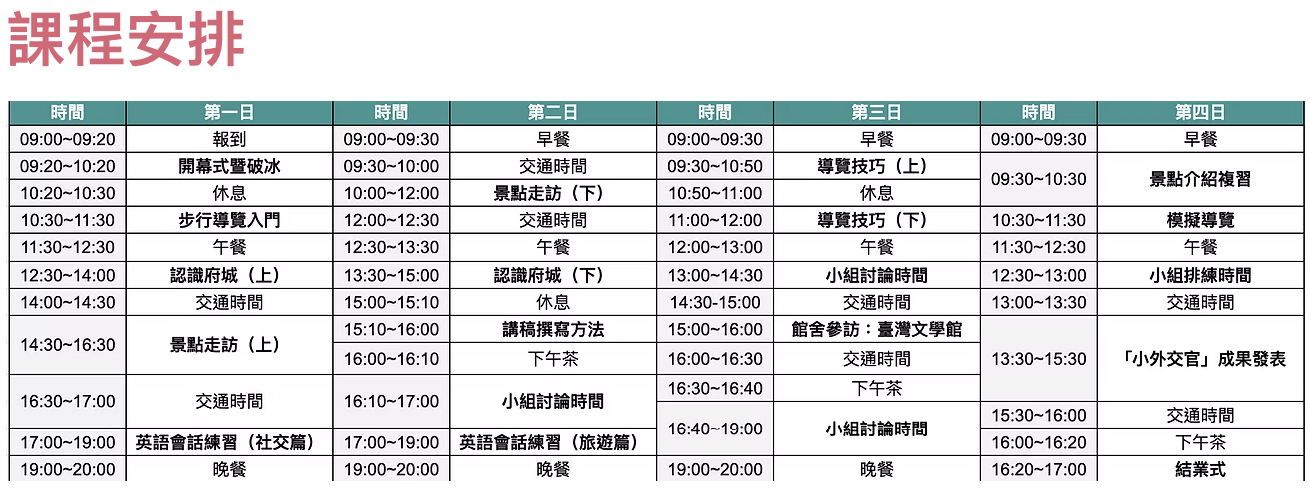 「青年外交官英語導覽營隊」涵蓋室內課程與室外活動,透過空間的轉換增加營隊的趣味性。全英文景點走訪,讓孩子走出教室,在名勝古蹟間用英語學習台灣的歷史和文化,跳脫學校語言教學框架,在生活中自然應用英文,讓寒、暑假期成為在校學習的延伸。