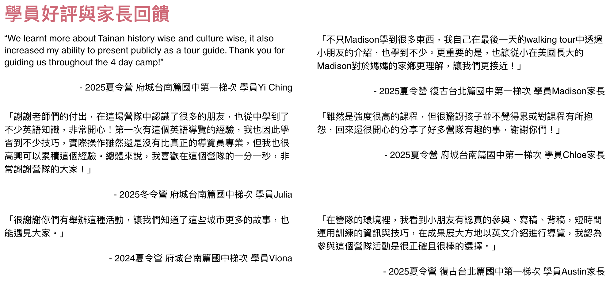 藉由實際走訪景點,貫穿古今,讓學員體驗台南城市縮影,並建立自己對在地城市的獨特連結與記憶。藉由資深講師的引導、全英語的環境,用英文重新認識府城的歷史足跡;專業助教的近身指點,讓孩子輕鬆交流學習,自在開口說英文。